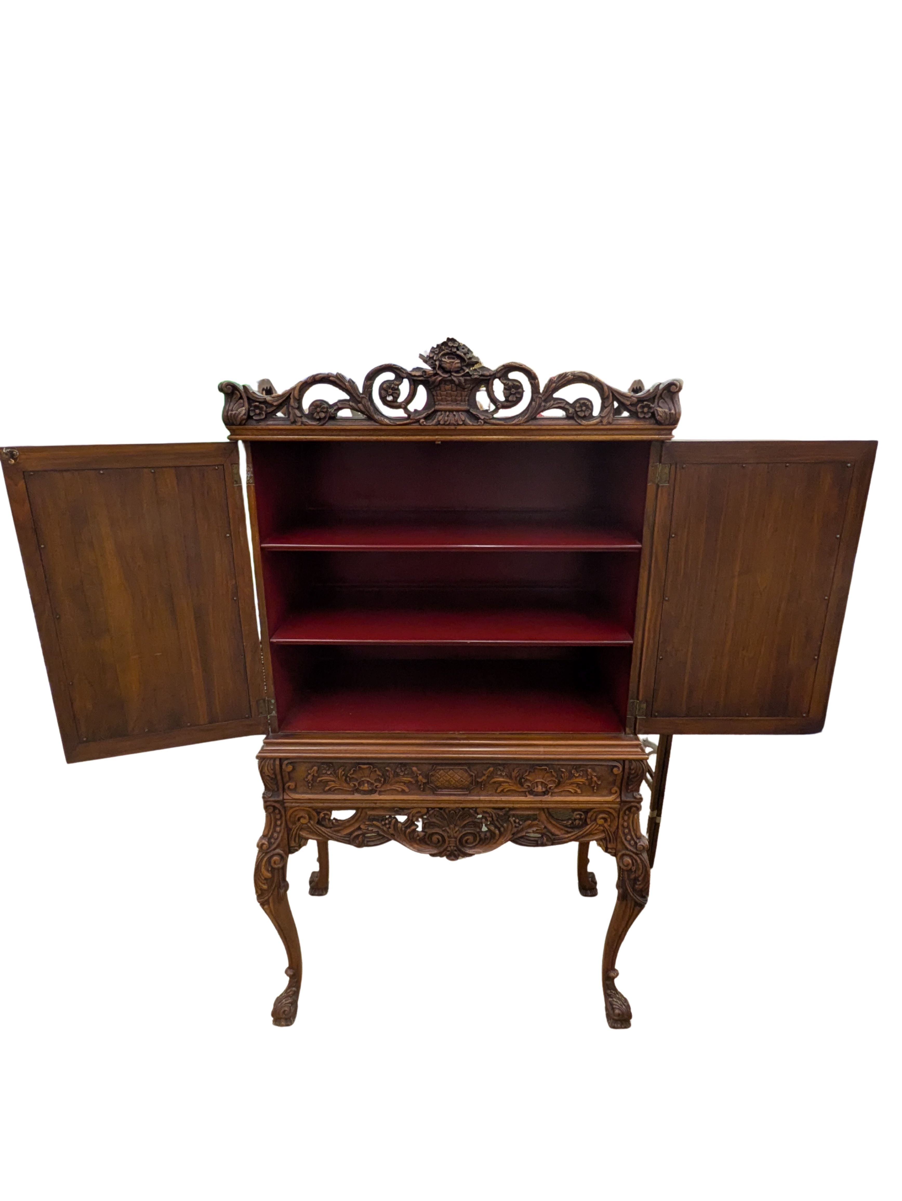 Keywords: English walnut cabinet, blind cabinet, Victorian furniture, Renaissance Revival, carved cabinet, cabriole legs, ball and claw feet, 19th century furniture, walnut storage cabinet, ornate carved crest, basketweave carving, English antique cabinet, Rhode Island estate, carved door panels, Victorian case piece, Rococo Revival, hand carved walnut, storage cabinet with drawer, fixed shelves, burgundy lined interior, scrollwork base, pierced carving, antique furniture, collectible cabinet, drawing room furniture, Victorian walnut, ornate cabinet, carved basket crest