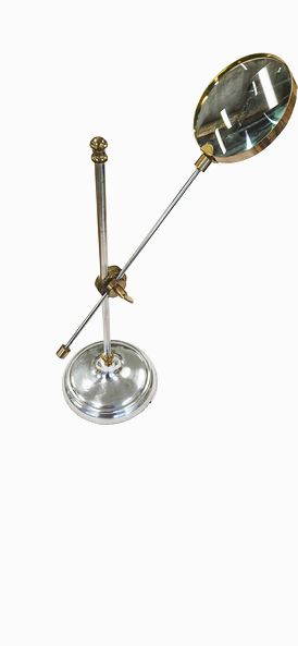 Keywords: desk magnifying glass, adjustable magnifier stand, brass and chrome magnifier, tabletop magnifier, desktop magnifying glass, articulating arm magnifier, study magnifier, library desk accessory, vintage magnifier, brass desk accessory, hands-free magnifier, gentleman's study decor, office magnifier, collectible magnifier, map reader, reading magnifier, scientific instrument decor, home office decor, antique style magnifier, functional desk decor