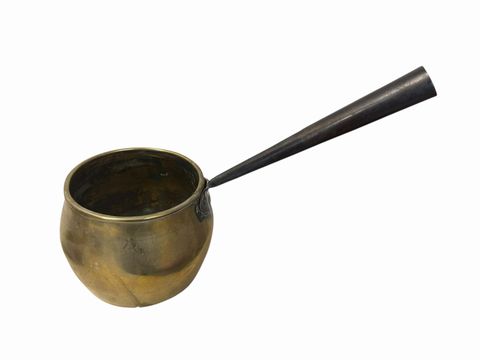 Antique cast brass brandy warmer w/ iron handle, 6.5" diam.