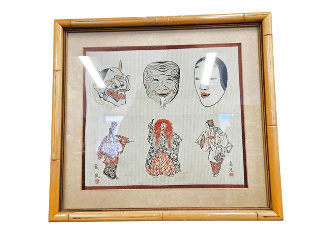 Bamboo Framed Chinese Silk Embroidered Actors+Masks 14"h x 16"w