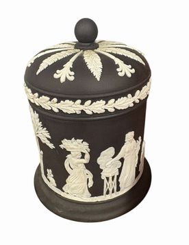 Black Wedgwood jasperware lidded tobacco jar, 4.25" h
