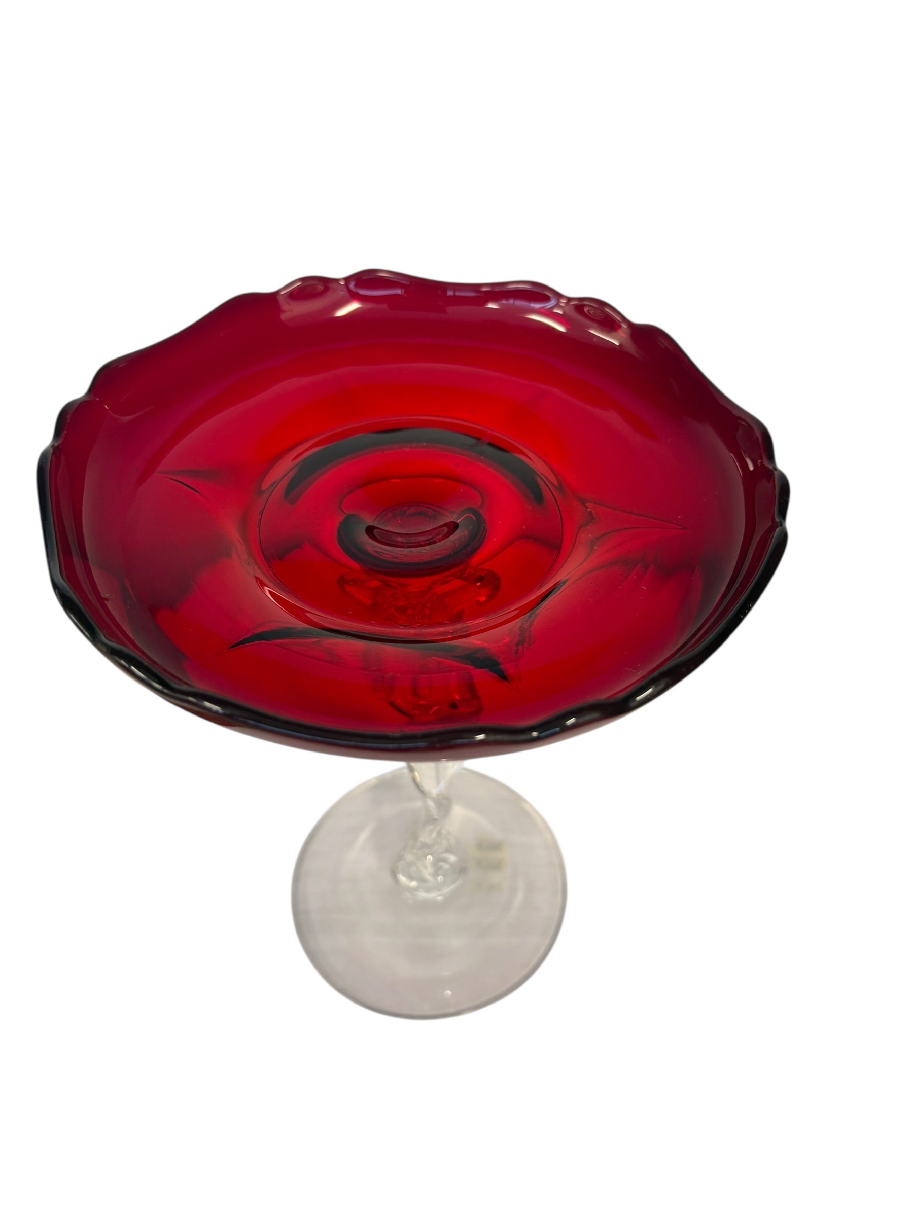 Cambridge Glass "Statuesque" compote w/ figural stem & ruby red bowl, 8" h, 6.5"