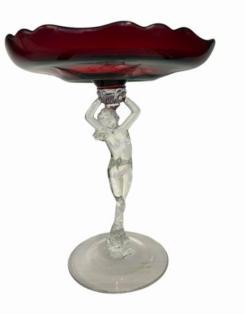 Cambridge Glass "Statuesque" compote w/ figural stem & ruby red bowl, 8" h, 6.5" diam.