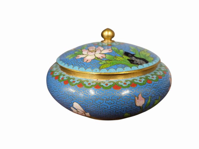 Chinese 19th-century cloisonne powder bowl w/ lid, 3.25" h, 5" diam.