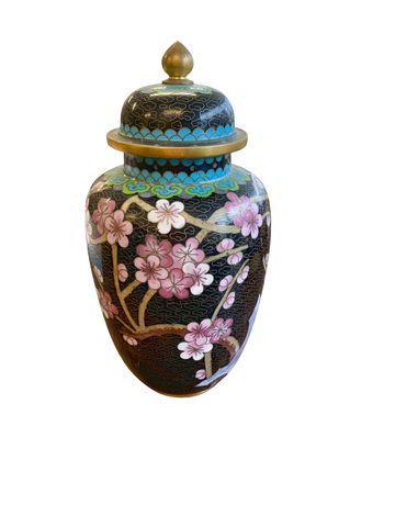 Chinese Cloisonne Lidded Jar w/Flower Motif 8x4"