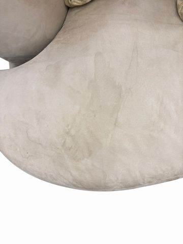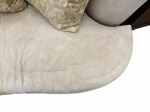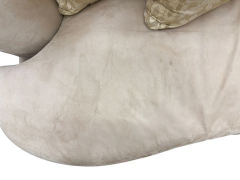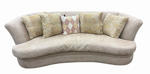 Curved-back beige microsuede sofa w/ 4 pillows (as is), 33" h, 96" w, 29.5" d