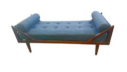 Modern tufted blue daybed w/ 2 bolster pillows, 6' 5" l x 27.5" d x 24" h