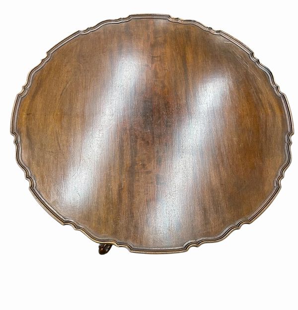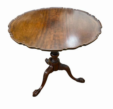 Few furniture forms capture the elegance of 18th-century cabinetmaking quite like the pie crust table, and this handsome example delivers that classic appeal with generous proportions and well-executed carved detail. The circular top features the signature scalloped "pie crust" edge — a rhythmic series of raised, shaped curves carved from solid mahogany rather than applied separately, which is the hallmark of quality construction in this form. At 34 inches in diameter, the top is notably spacious, making it equally at home as a lamp table, side table, or occasional center table.