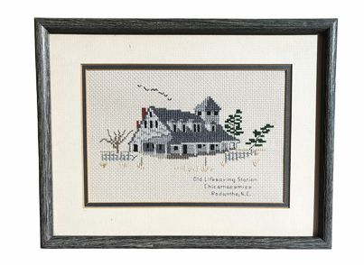 Framed cross-stitch of Rodanth Old Lifesaving Station, 8.75" h x 11.25" w