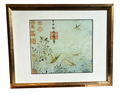 Framed offset Chinese print of grasshoppers in a natural setting, 12" h x 15" w
