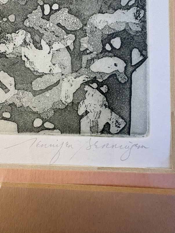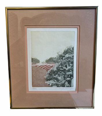 Framed signed/numbered pulled lithograph of rural setting, signed, 14.25" x 12.2