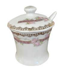 German porcelain mustard pot w/ spoon, 3" h, 2.25" diam.