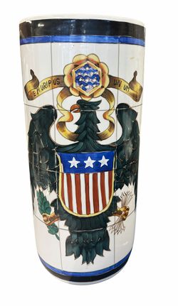 Handpainted ceramic umbrella stand w/ Great Seal of the US, 18" h, 8" diam.