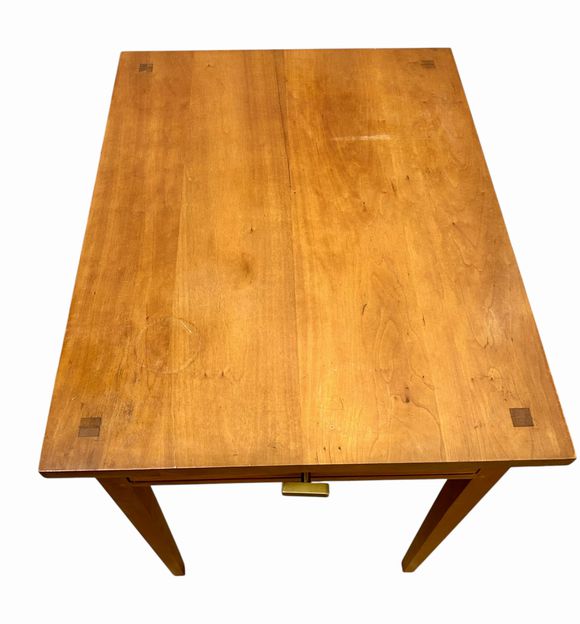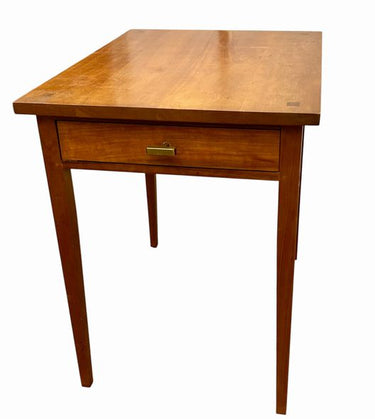 Keywords: Harden furniture cherry table, solid cherry side table, Harden Furniture New York, tapered leg cherry table, Federal style side table, Hepplewhite style table, American cherry writing table, brass bail pull table, vintage Harden furniture, solid cherry accent table, single drawer side table, American traditional furniture, cherry end table vintage, Harden cherry wood table, heirloom cherry furniture