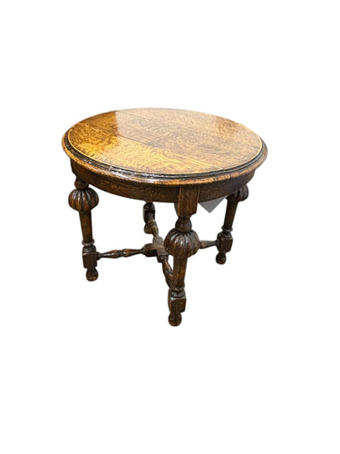 Jacobean-style round oak side table, 18.75" h, 21" diam.