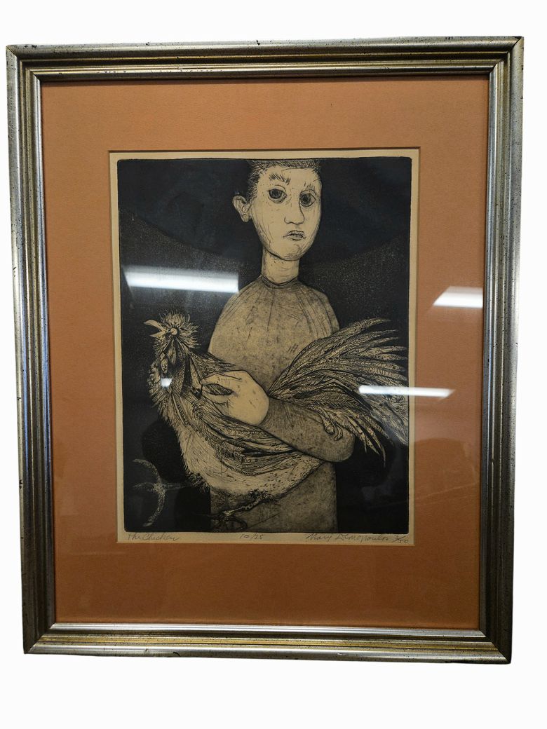 "Chicken," signed/numbered etching by Mary Demopoulos, 22"h x 17.5"w