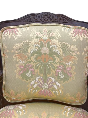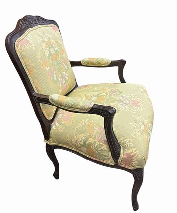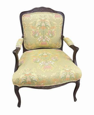 Louis XV-style armchair w/ yellow-green brocade upholstery, 36" h, 26" w, 22" d
