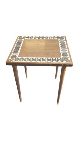 Small in scale but big on personality, this mid-century modern accent table is a textbook example of the decorative tile-top furniture that became enormously fashionable during the late 1950s and early 1960s. The square top features a warm wood-toned center field — likely a laminate or veneer — framed by a continuous border of small geometric mosaic tiles in muted tan, grey, and off-white, set in a repeating pattern that creates a satisfying visual rhythm all the way around. Four slender tapered legs in warm walnut-tone wood complete the composition, giving the table the clean, low-slung silhouette that defines the best of mid-century American furniture design. Everything about it is deliberate and composed — this is a piece that understood exactly what it was trying to be.