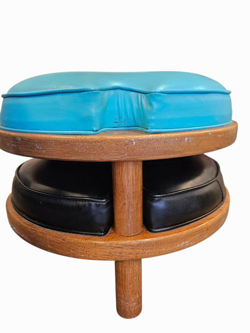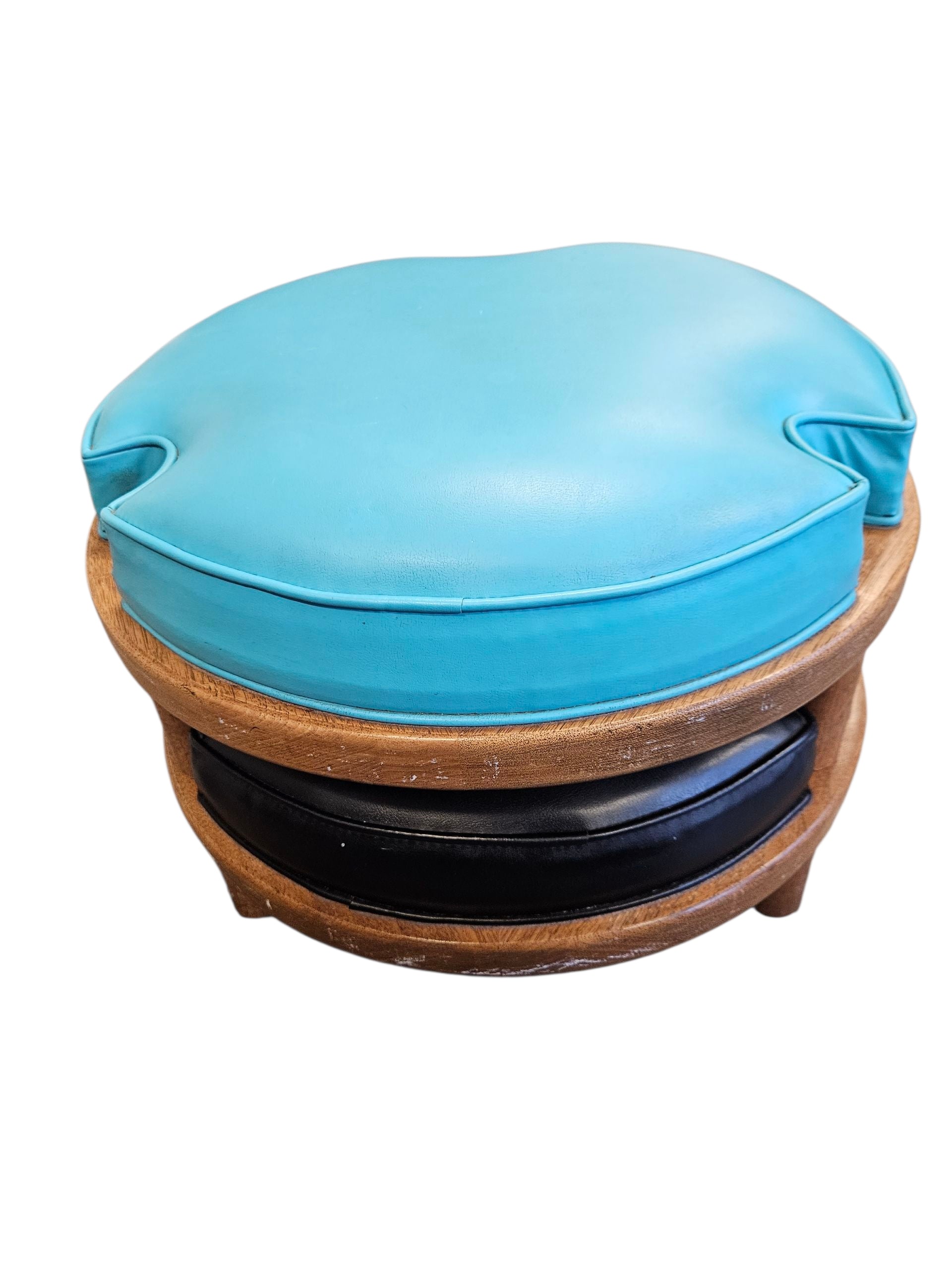 MCM Wood 2 Tiered, 2 Pc Stool+Leather Cushions, Teal & Black 14"h x 17"dia