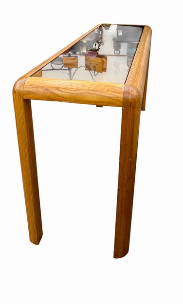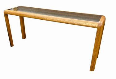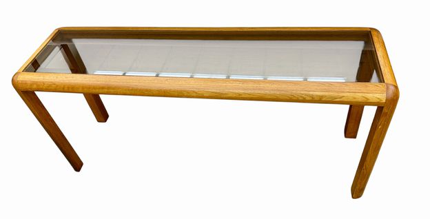Mid-Century Modern Oak Console Table with Glass Insert, H. 27.25 in. x W. 60 in. x D. 16.5 in.