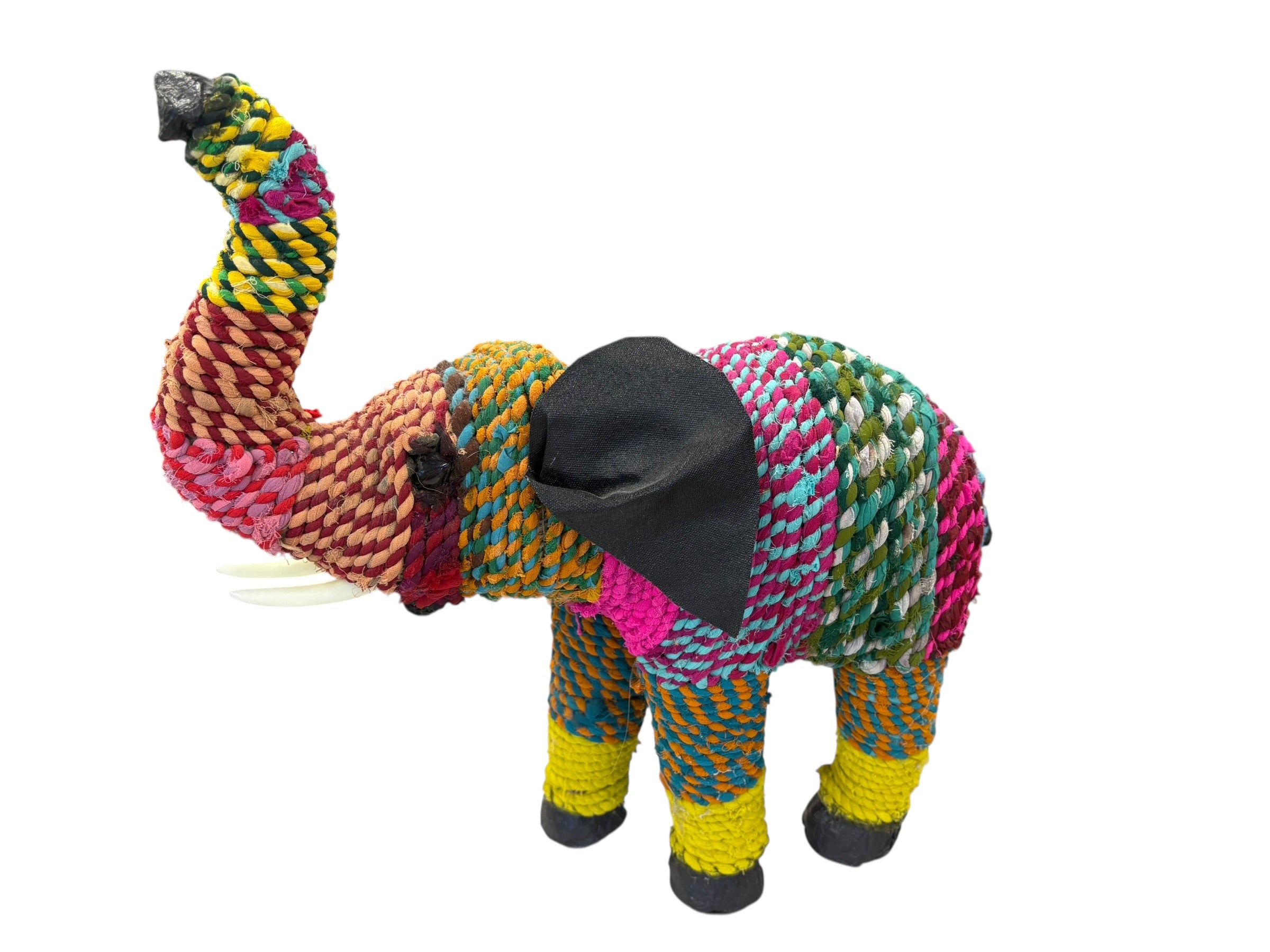 Multicolored Chindi fabric rope-wrapped elephant, 16" h x 14" w x 6" d