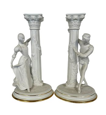 PAIR of Romeo and Juliet bisque porcelain candleholders, 9.75" h