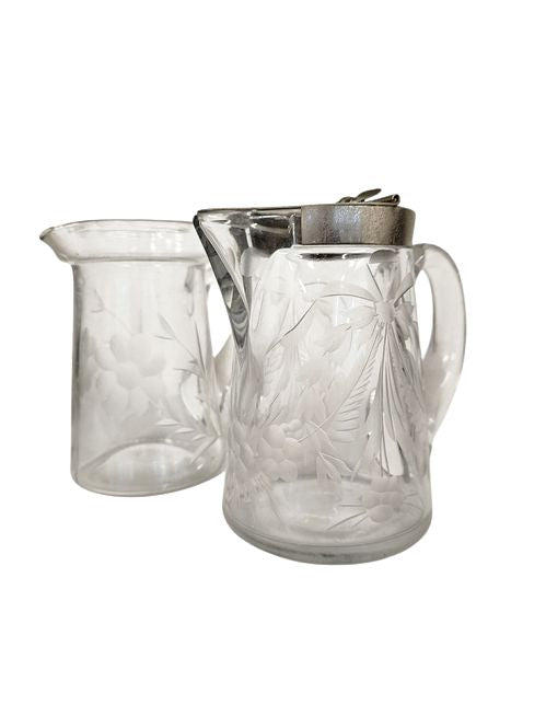 PAIR of small vintage cut-glass pitchers, 1 w/ metal lid, 4.25" h