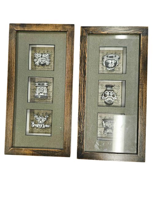 Pair Shadowbox Mayan Figureheads 15"h x 7"w