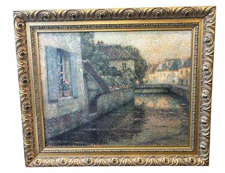 Repro. in ornate gold frame of "The Bridge at Gisors" by Henri Le Sidaner, 29" h x 35" w