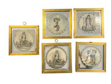 Set of 5 small antique goldleaf-framed colored engravings on patterned mirrored background of London children, ca. 1800-20, 5.75" x 5.75"