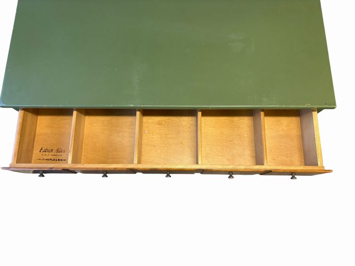 Ethan Allen was founded as the Baumritter Corporation in 1932 by brothers-in-law Nathan Ancell and Theodore Baumritter, and throughout its heyday their furniture was built primarily from solid maple, oak, and cherry in the American Colonial and Early American Revival traditions. By the middle of the 1960s, the Ethan Allen catalog contained nearly 1,600 pieces, and the company's reputation rested on exactly the kind of solid, well-built case construction evident here — sturdy drawer construction, clean joinery, and reliable hardware that still functions decades later. The avocado green paint on the case and base is a period detail that collectors and design enthusiasts have come to appreciate as a genuine artifact of 1960s–1970s American domestic life, when that earthy, muted green appeared on everything from kitchen appliances to automobiles.
