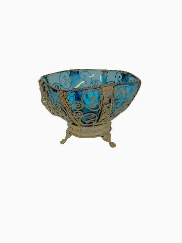 Vintage Blue Glass Bowl w/Ornate Scrolled Metal Filigree Casing 3x5"