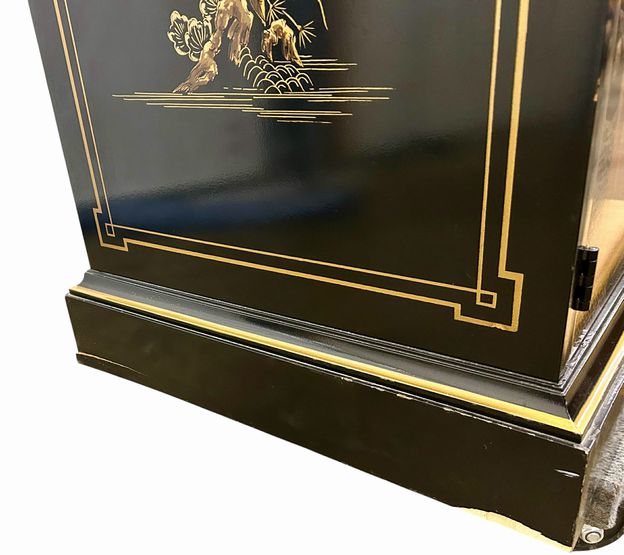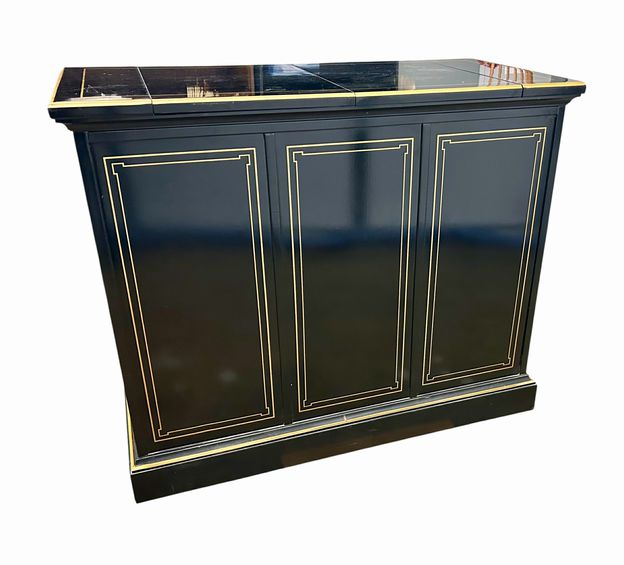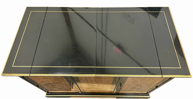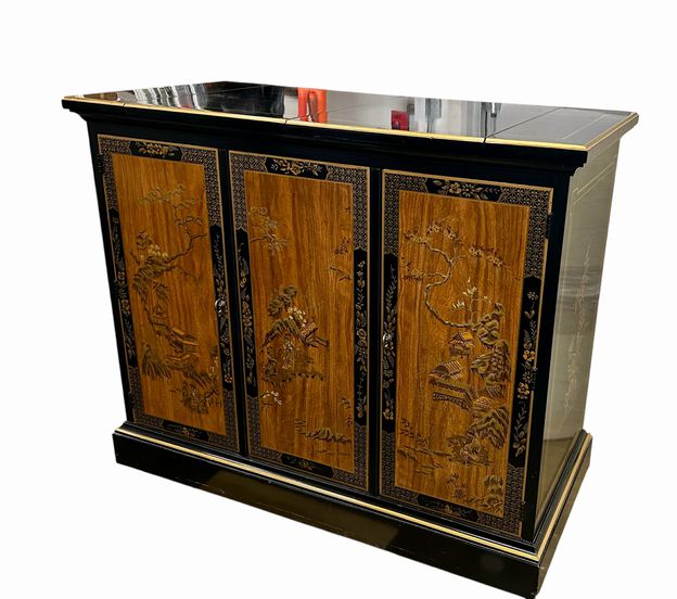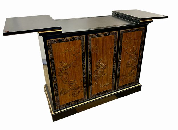 Vintage Drexel Black Lacquer & Chinoiserie Flip Top Serving Sideboard Bar (as is) H. 32 in. x W. 39.25 in. x D. 19 in.