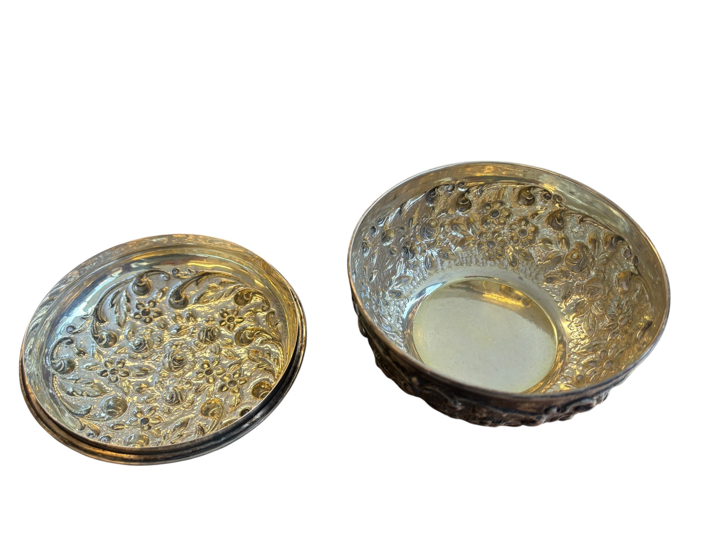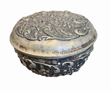 Vintage footed embossed silverplate trinket box w/ lid, 3.5" h, 5" diam.