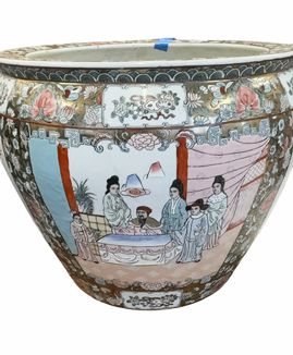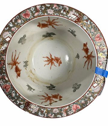 Vintage Chinese rose medallion porcelain koi fishbowl planter, 12" h, 14.5" diam